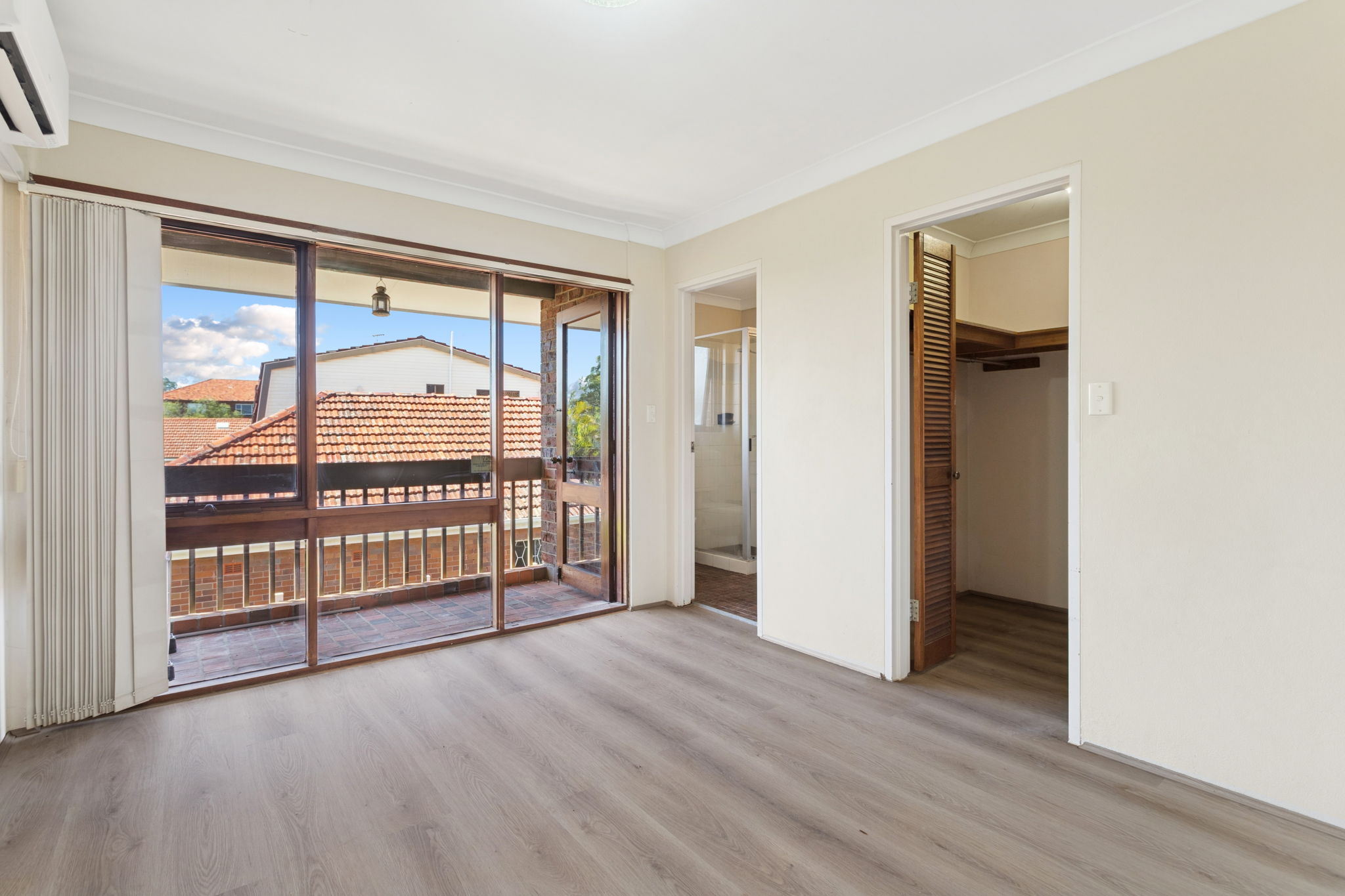 The property features a sunlit, north-facing garden courtyard, perfect for outdoor entertaining and BBQs. Upstairs includes a spacious master bedroom with walk-in wardrobe, ensuite, and private balcony.